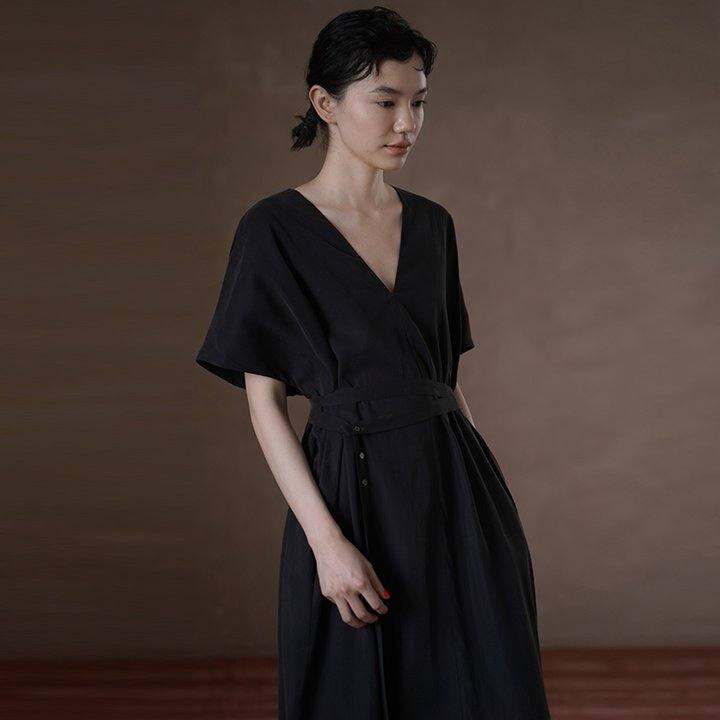 哈齿小姐 简约低调老钱风宽松H型慵懒缠绕腰带V领显瘦遮肉连衣裙