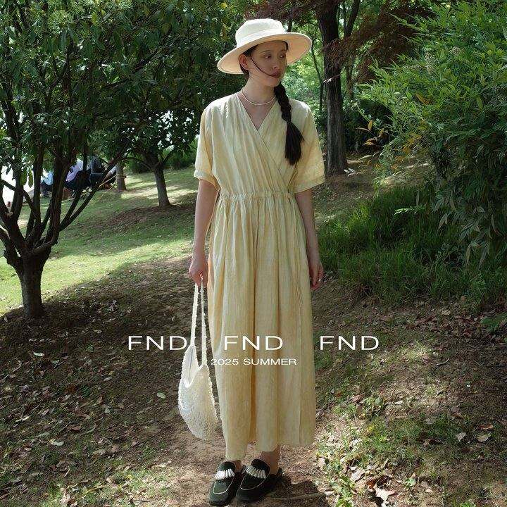 FND方南町 荧光之森/夏日宽松淡黄肌理提花短袖连衣裙