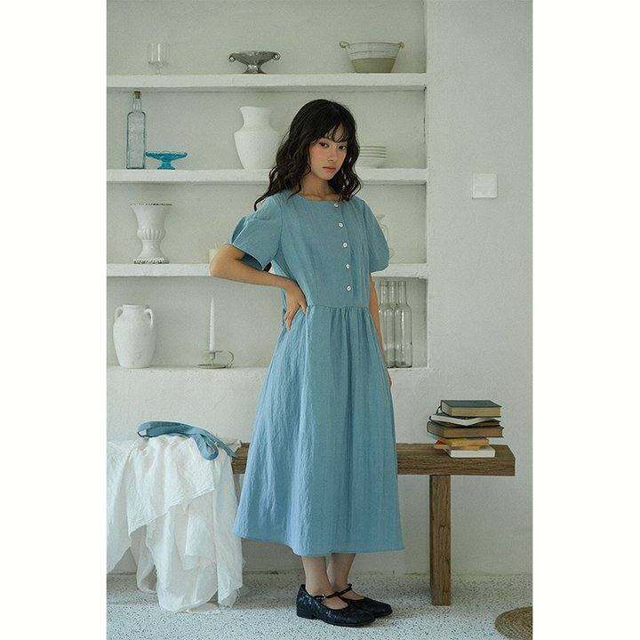 25夏季莱赛尔斜领收腰A字肌理感连衣裙通勤长裙设计感裙子显瘦