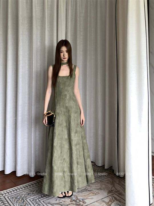 Best U复古气质暗花吊带连衣裙女春夏新款法式收腰显瘦a字长裙子