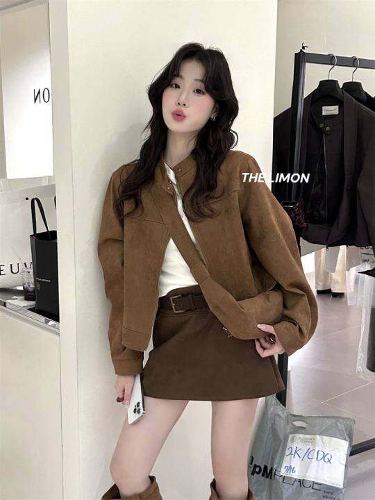 THE LIMON柠檬绿茶2025冬季韩系麂皮绒短外套酷飒风宽松夹克皮衣
