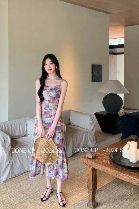UONE UP法式收腰复古油画小碎花吊带连衣裙女春夏季度假风长裙