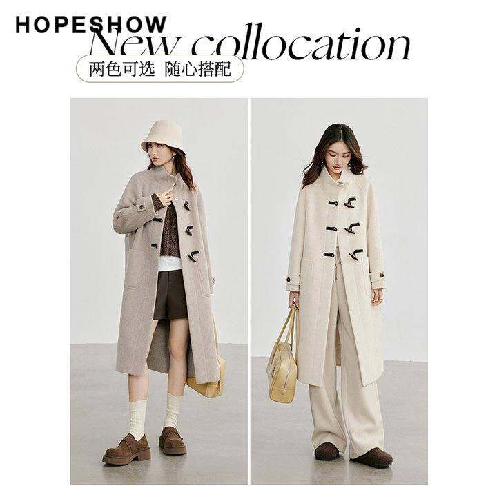红袖牛角扣毛呢外套冬季2024新款女装连肩袖立领学院风双面呢大衣