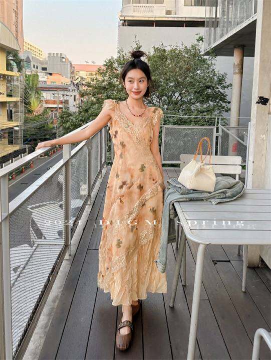 DIGM法式复古蕾丝花边拼接收腰碎花连衣裙飞飞袖吊带V领中长裙潮