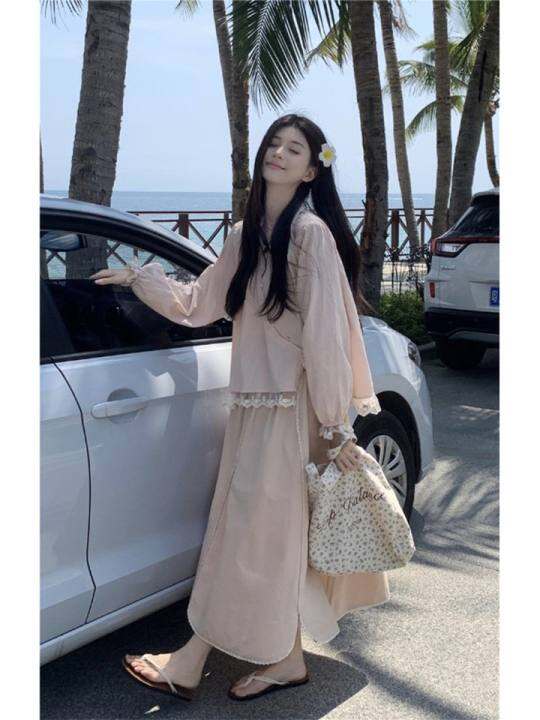今年流行漂亮温柔度假风套装女2024春秋新款刺绣蕾丝半身裙两件套