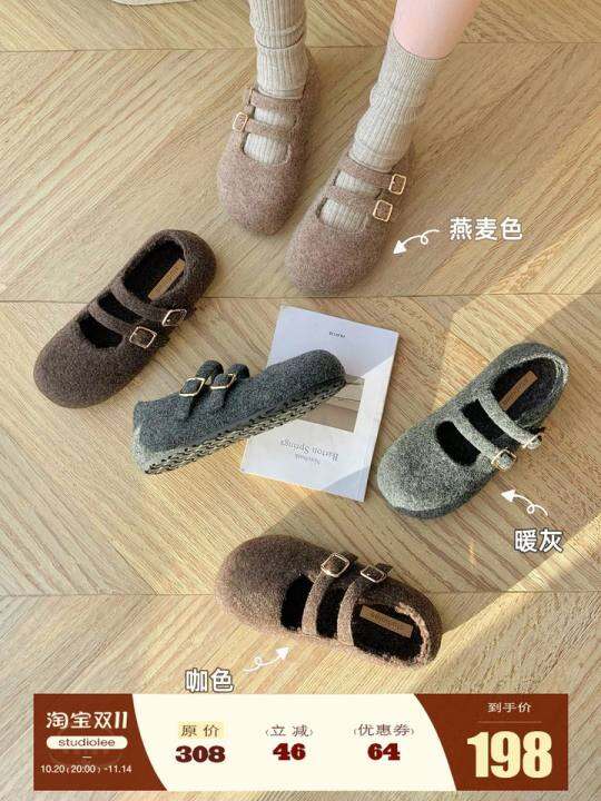 葡萄妈studiolee增高3.5cm~ 圆头双扣带勃肯毛呢玛丽珍毛毛单鞋女