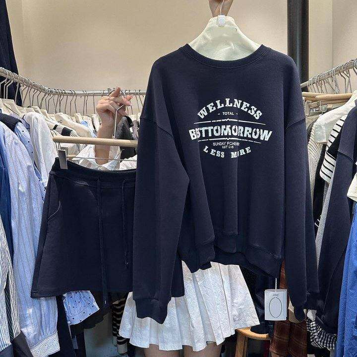 买的深蓝M码 很宽松的版型,蛮韩的,首页有晒单,留不留还在考虑,上衣有点太大了,领口对我这种方圆脸有点显脖子短😢