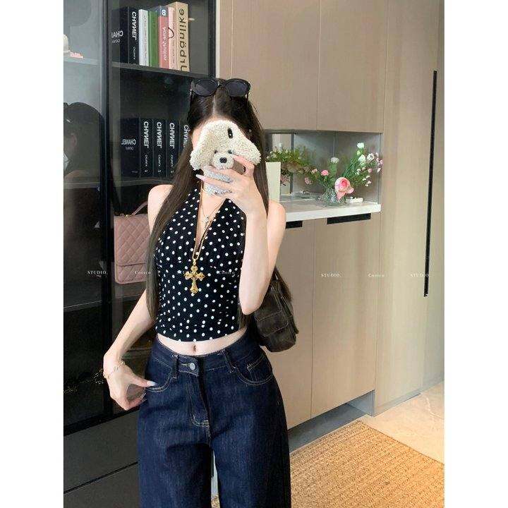 kumikumi辣妹风复古波点挂脖背心女夏季性感V领修身短款无袖上衣