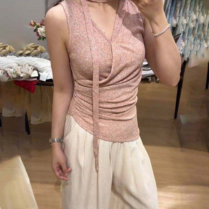 粉色V领不规则交叉挂脖吊带背心女夏季外穿修身无袖飘带小众上衣
