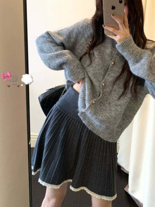 可可里自制~蕾丝花边高腰针织半身裙子秋冬设计感百褶裙A字短裙女