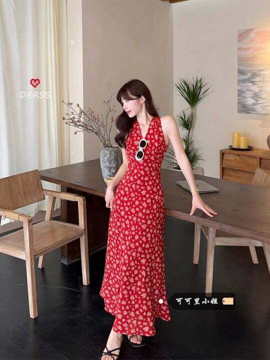 可可里碎花露背挂脖连衣裙女夏季新款纯欲辣妹气质收腰修身长裙子