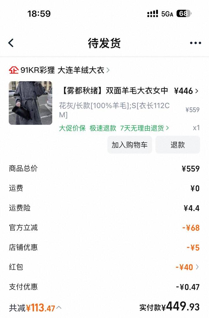 大衣留了这个,春天的时候就看上了,没舍得买,反季刷到好像更便宜大概400多,这次希望加上长袖羽绒内胆不会在北京被冻死,比彩狸的质感更好点,毕竟价格贵一点,领子比彩狸的好看,彩狸的领子实物软塌塌的,没有模特图硬挺