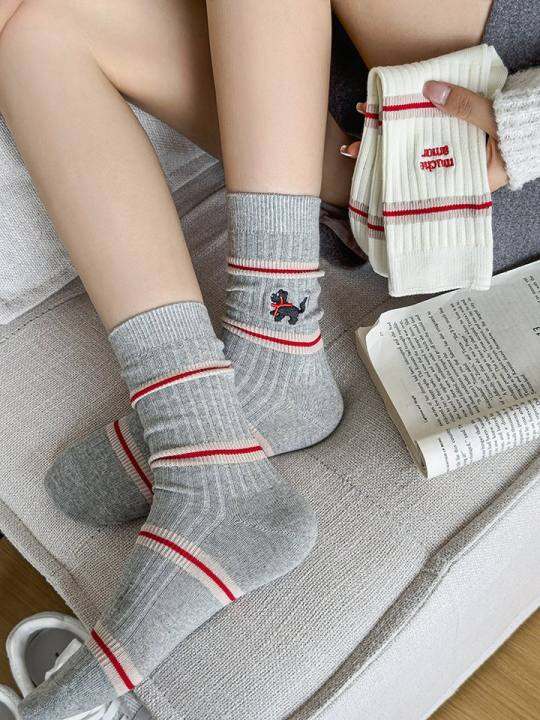 不对称的条纹袜子妇女的中小腿袜2025新热风格可爱的Ab卡通小狗袜子妇女的长袜