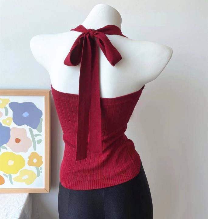 港风复古挂脖大露背吊带暗红显白平口绑带弹力针织背心内搭上衣女