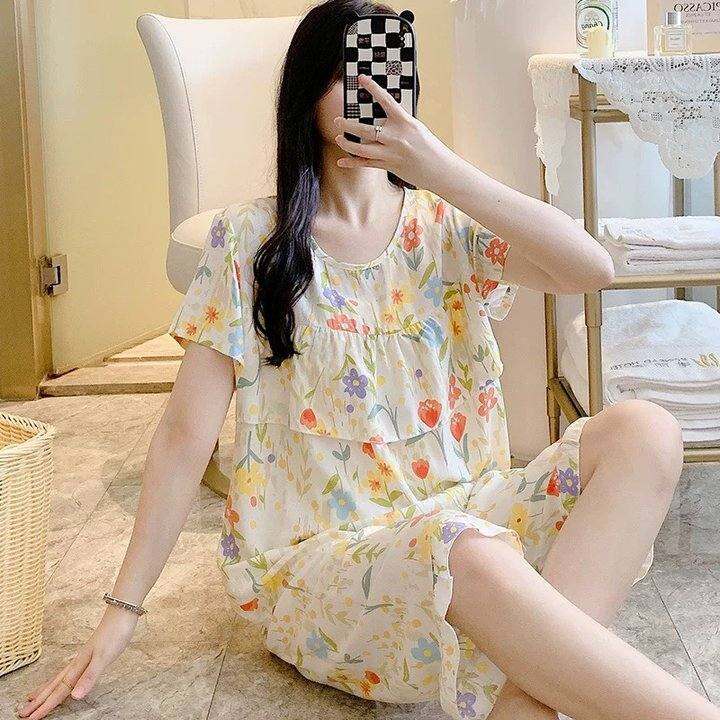 短袖棉绸睡衣女春夏新款人造棉家居服日系花卉防凸点大码绵绸套装