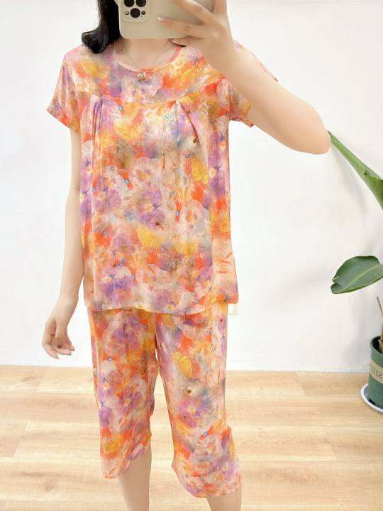 夏季女棉绸睡衣短袖七分裤套装人造棉宽松碎花短袖少女家居套装