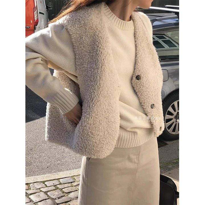 猪欧尼 韩国东大门秋冬复古V领皮毛一体两面穿羊羔毛马甲外套女