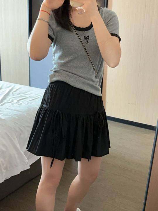 大脑门 纯欲风甜妹松紧腰高腰系带蝴蝶结半身花苞蓬蓬短裙Q24121
