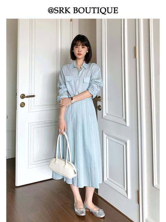 SRK 法式休闲蓝色套装条纹肌理衬衫气质温柔慵懒a字百褶半身裙
