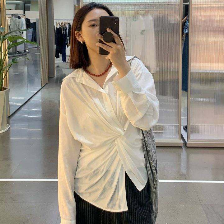 不对称肌理感轻透纽结宽松廓形翻领衬衫