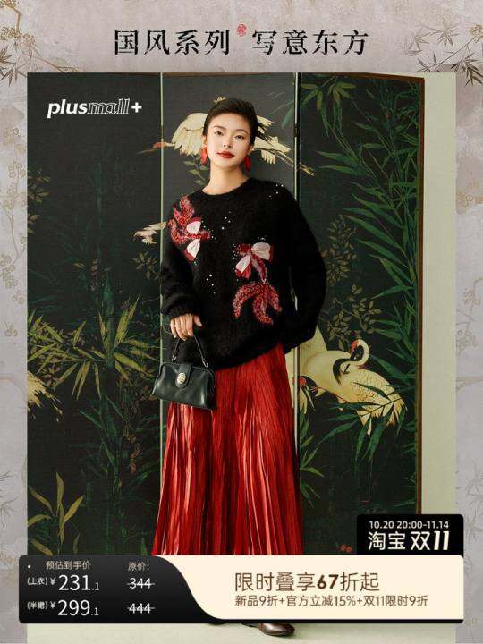 PLUSMALL 锦鲤映波光 重工珠片金鱼圆领毛衫加褶皱压褶风半裙套装