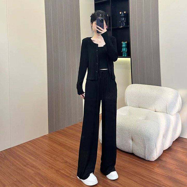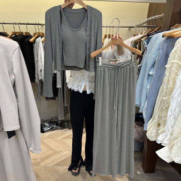 十三行早秋新款灰色t恤外套打底吊带背心女装套装高腰长裤三件套