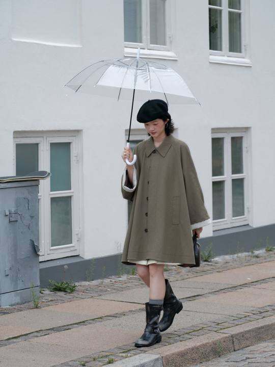 一方二集 爱丁堡魔法斗篷拼接刺绣格子翻折边中长风衣外套