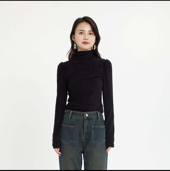 欧货德绒磨毛长袖t恤女2022新款春装上衣修身内搭泡泡袖打底衫潮