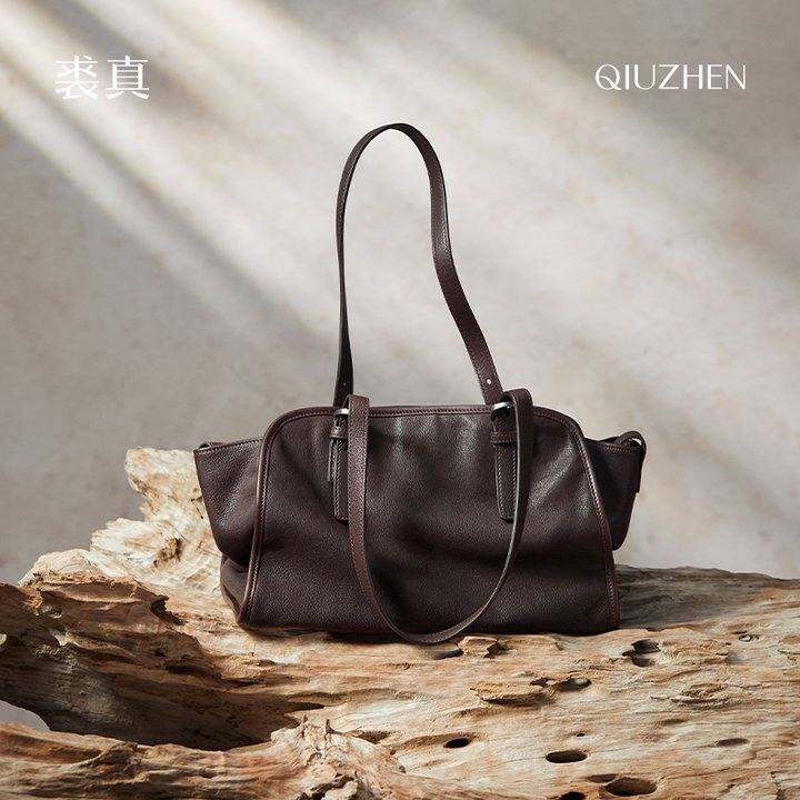 明星推荐裘真植鞣牛皮/羊皮元宝保龄球包复古大容量通勤包包女