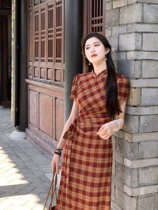 灵千河[暮光釉]新中国风改良女式旗袍春夏覆古格纹长裙