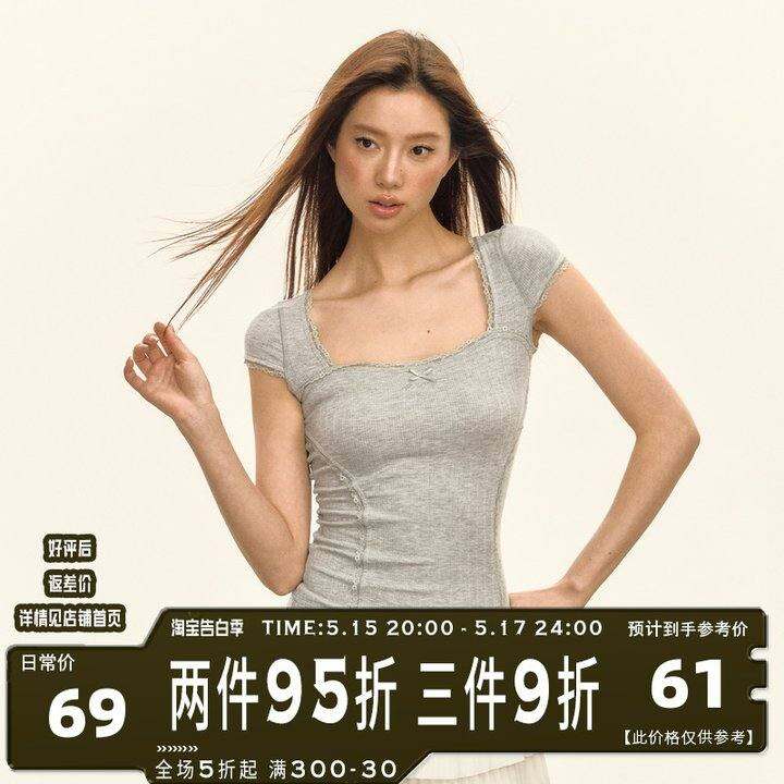 Ariseism 美式复古蕾丝边方领短袖t恤女2024夏季新款纯色修身上衣