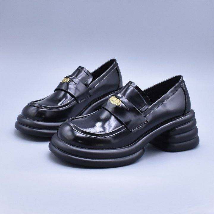 清~春秋简约粗跟乐福鞋女复古软底一脚蹬英伦小金币漆牛皮单鞋潮