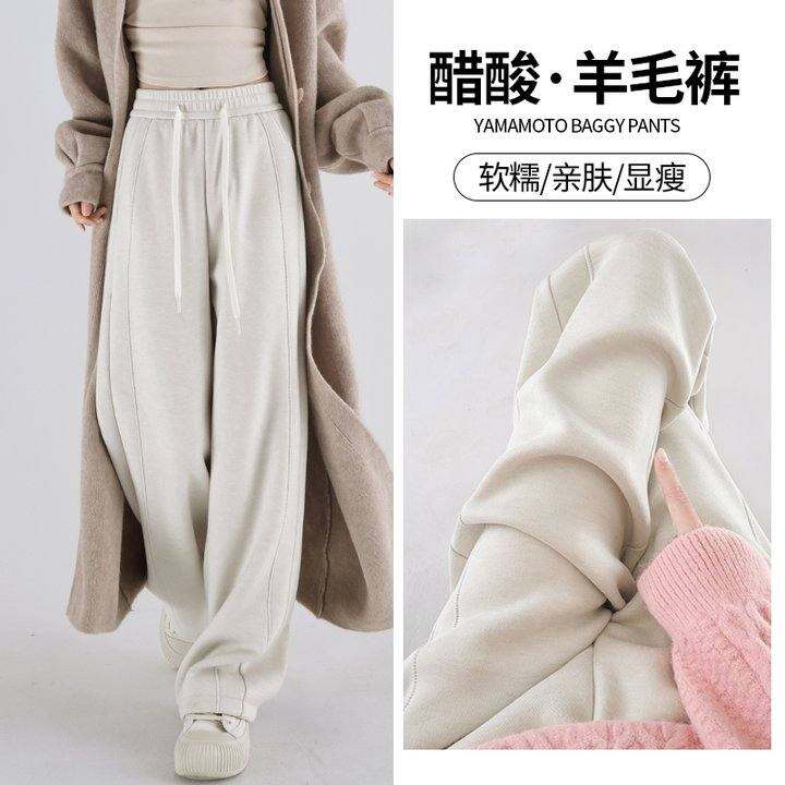 醋酸羊毛阔腿裤女秋冬垂感软糯冬季加绒毛呢直筒香蕉加绒白色裤子