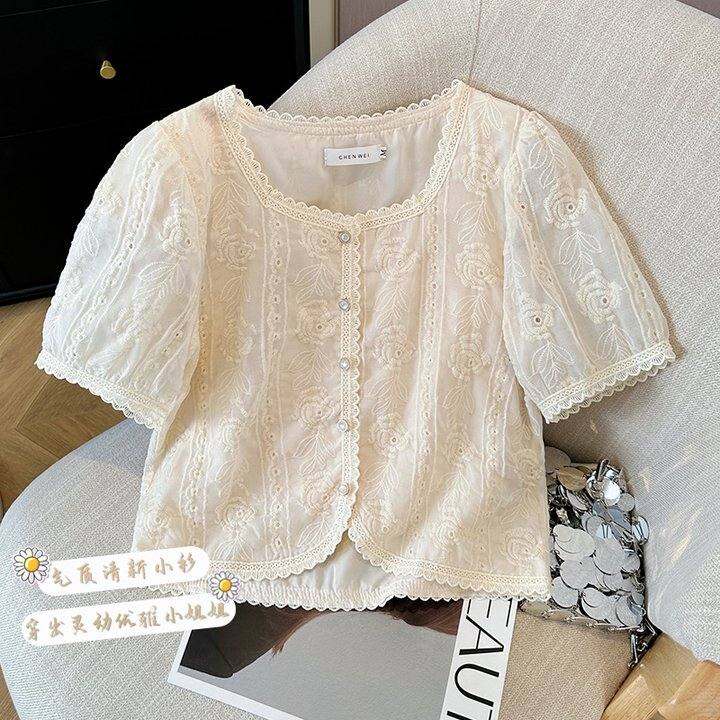 法式方领短袖蕾丝衬衫女装夏季新款小个子泡泡袖短款洋气减龄上衣