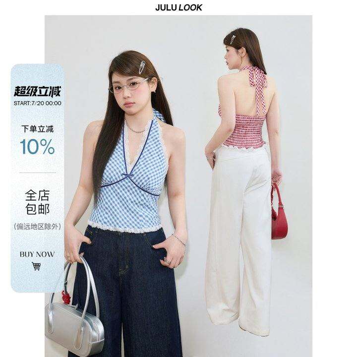 巨 巨鹿工作室“晴空格纹”微胖mm修身显瘦甜辣格纹挂颈背心大尺码上衣