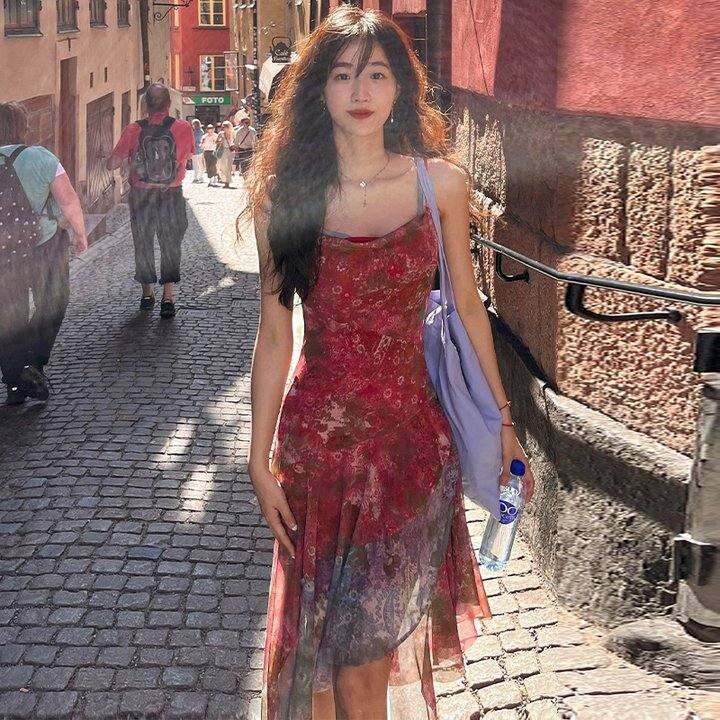 红色碎花不规则网纱吊带裙女夏季新款覆古小众设计洋装沙滩裙