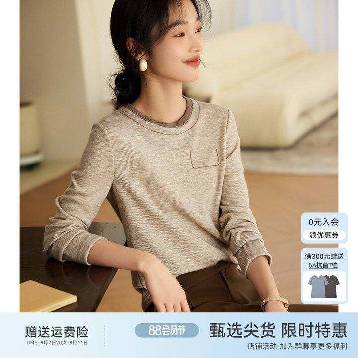 XWI/欣未领口撞色设计长袖T恤女2024年春季新款休闲简约通勤上衣