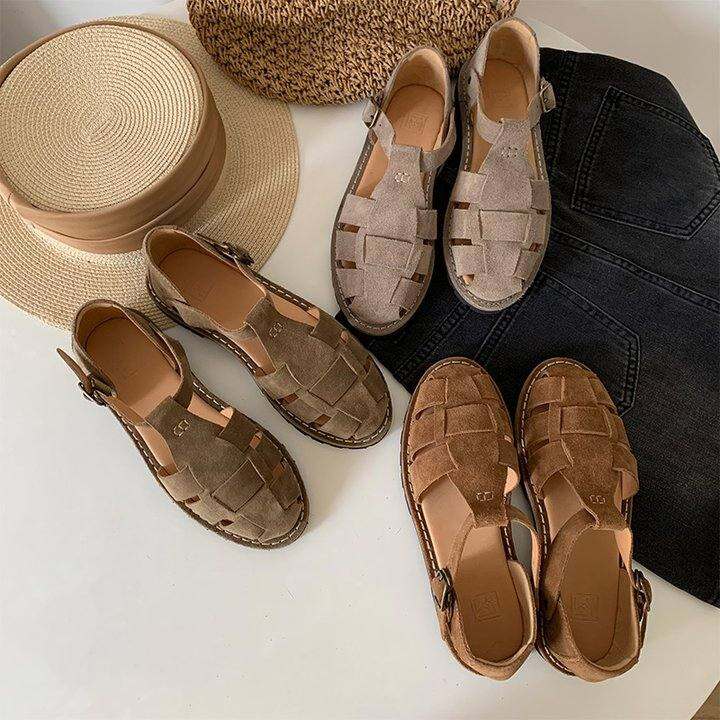 覆古编织罗马凉鞋为妇女2025新的软底利基设计低跟切割猪笼鞋厚跟真皮
