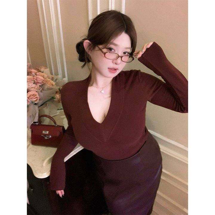 周白子 九重紫毛衣 微胖辣妹一字肩大翻领露肩修身毛织女开衫上衣