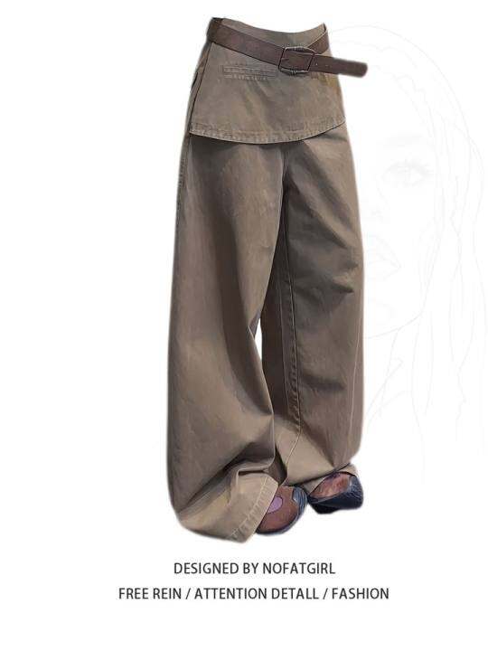 大码胖MM假两件工装风高腰阔腿裤女早秋季新款宽松显瘦卡其色长裤