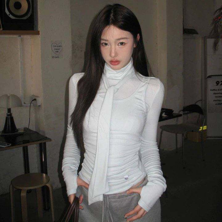 秋冬百搭设计感半高领假两件时尚绑带分指打底衫长袖内搭上衣T恤