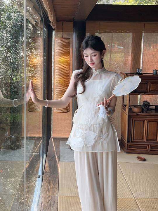 糯米家 新中式轻国风套装女改良款刺绣旗袍无袖上衣+凉凉裤两件套