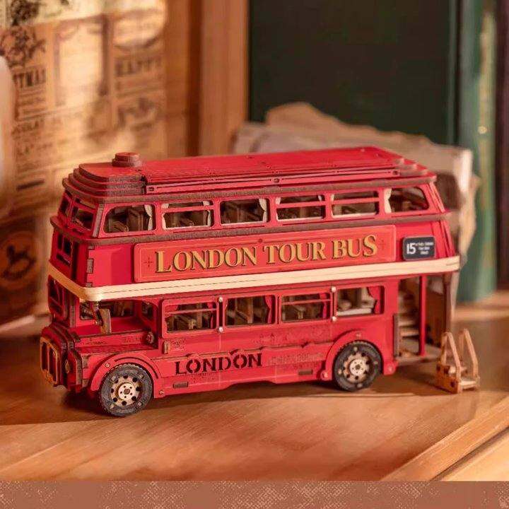 伦敦巴士双层木质汽车拼装模型若态若来3d立体拼图diy手工礼物