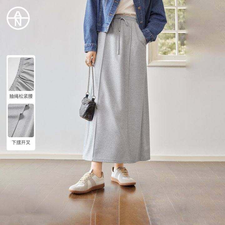 AN大码女装【氧气学院】韩系简约灰色卫裙秋冬胖mm休闲抽绳半身裙