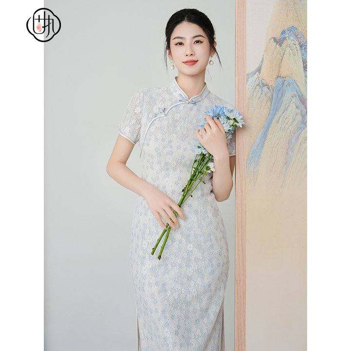 固执夏季新款中式复古立领盘扣蕾丝开衩日常短袖修身改良旗袍