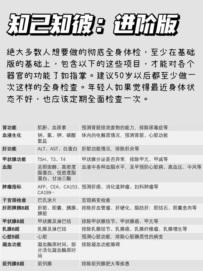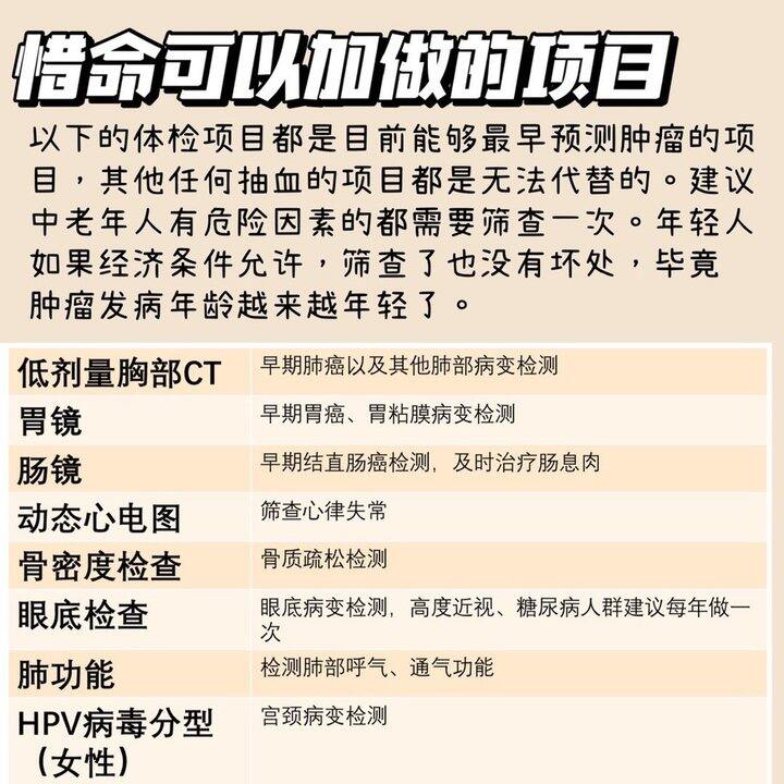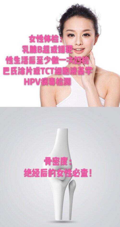 从博主dede-lab存的图的,图放不下了 文字补充说明女性应更加关注乳腺/妇科检查 /hpv病毒检测 tct。tct我记得貌似是一年检一次 连续几年检查无异常可考虑三年查一次。