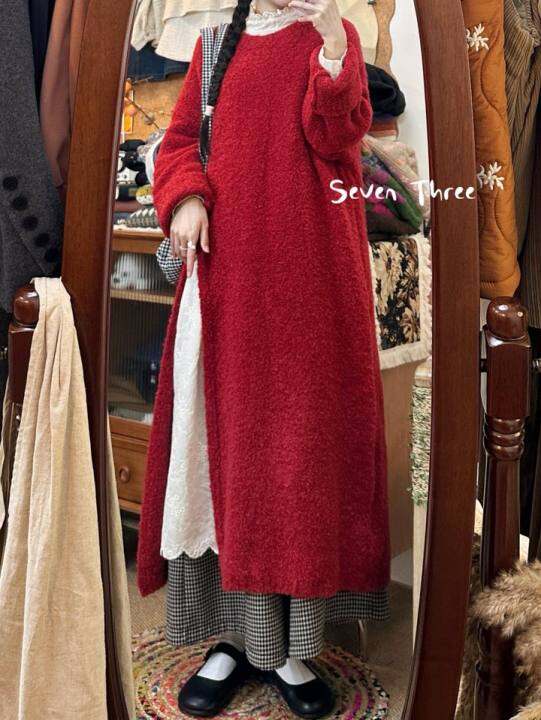 三七 秋冬侧开叉圈圈毛针织连衣裙侧开叉中长款圆领毛衣日系叠穿