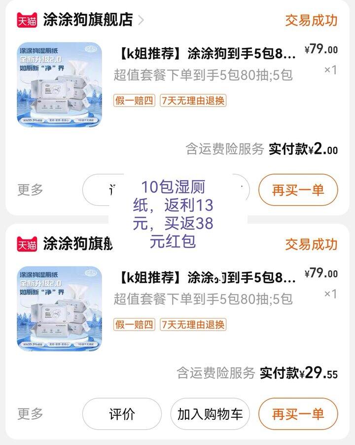10包湿厕纸31.55元返利13元,剩余38元买返红包