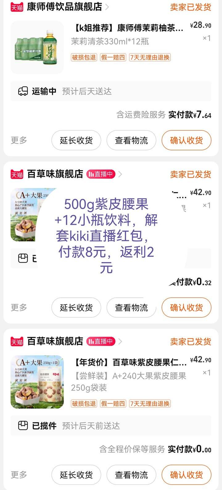 500g百草味腰果+12瓶康师傅茉莉清茶