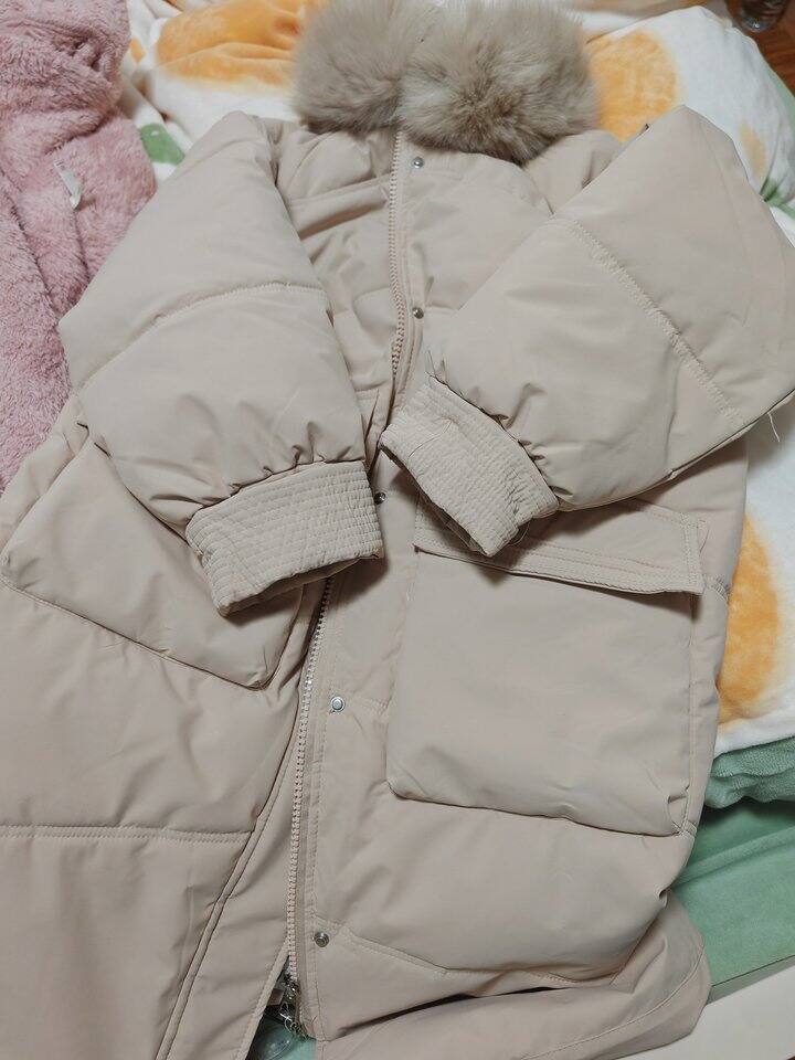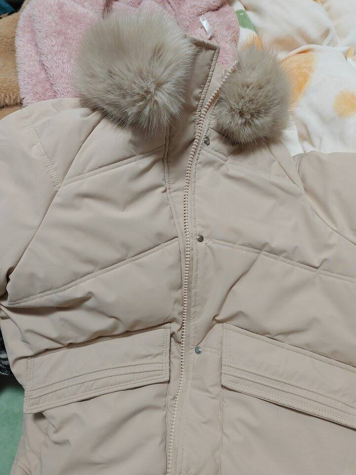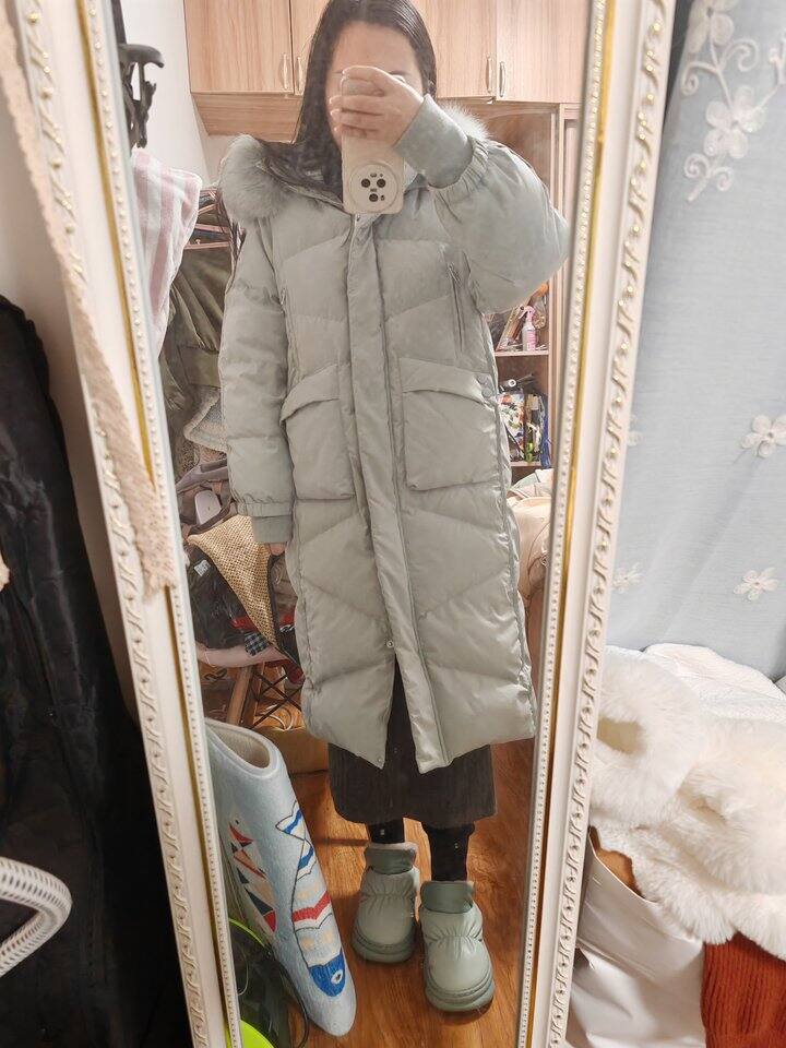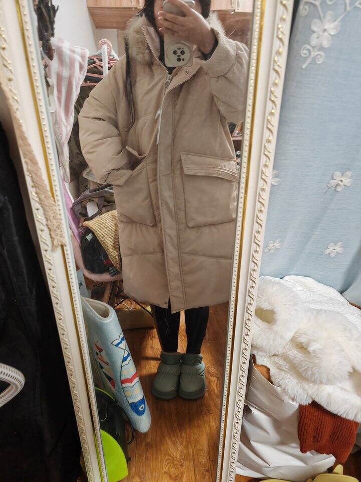拍照镜子有点糊,可能自动加亮了,感觉版型有点宽,款式其实就是网红款吧,跟我自己买的蓝色的比起来真的版型有点偏大的感觉也没很厚。款式是适合矮个子我155到膝盖,长度是还可以。质量一般有点掉毛。大家觉得呢。